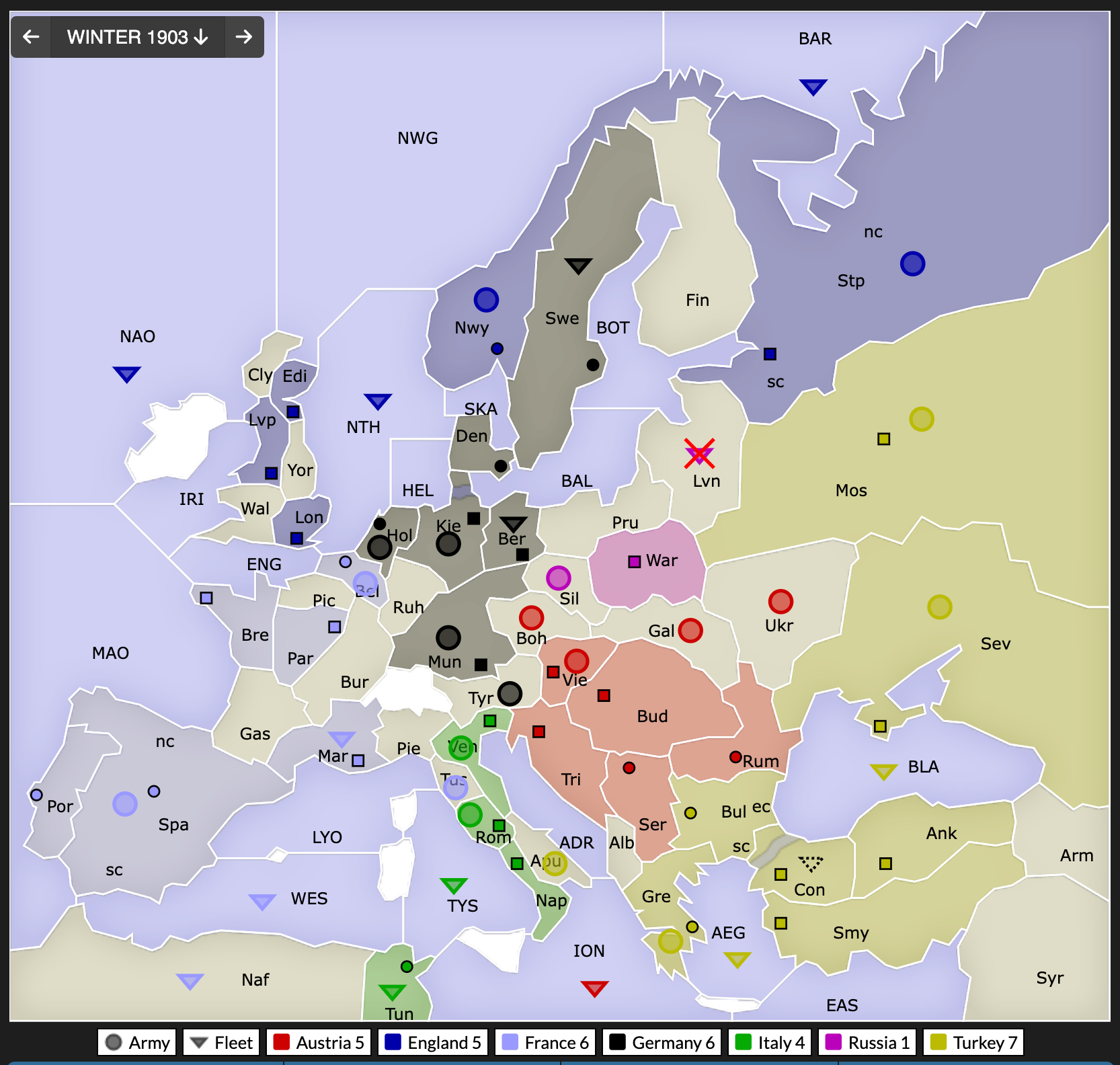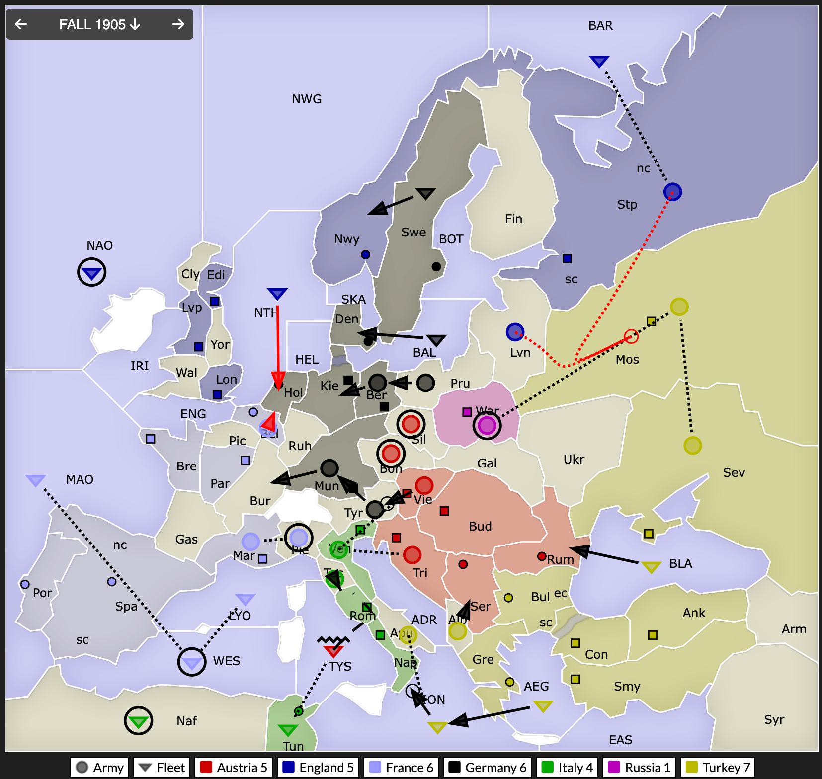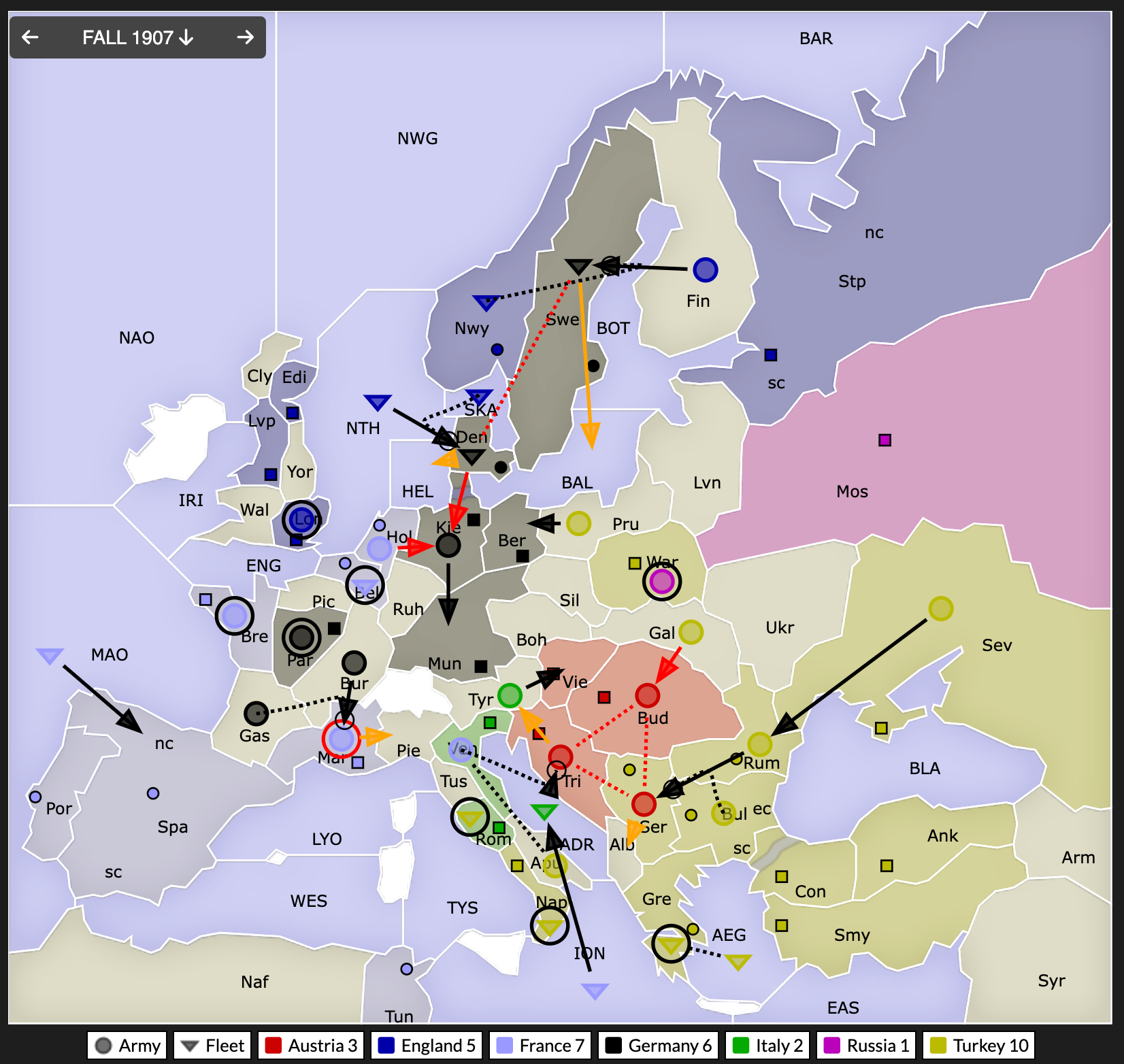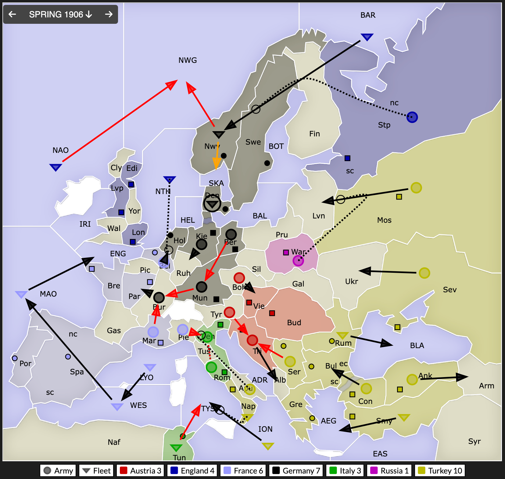 Σε αντιστάθμισμα των Ρωσικών κερδών, η Αγγλία παίρνει το StP και η Γερμανία μπαίνει στην Σουηδία. Στα Βαλκάνια, περασμένα-ξεχασμένα όσα έγιναν μεταξύ Αυστρίας και Τουρκίας, οι οποίες κάνουν αποστρατιωτικοποίηση προς μείωση της έντασης. Η Τουρκία παίρνει την Τυνισία με άριστα tactics.