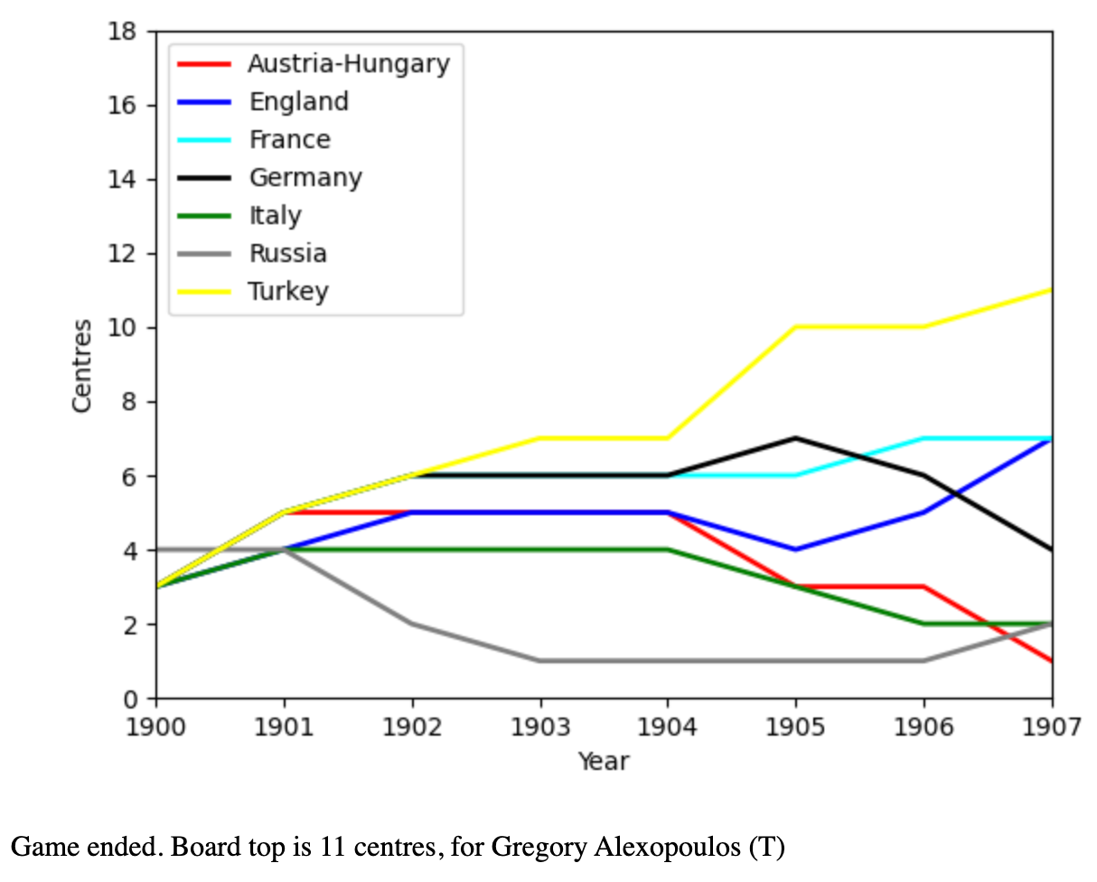 Βέβαια αυτό δεν απέτρεψε την Ρωσία να stabάρει την Γερμανία στο τέλος για 2 κέντρα την ίδια ώρα που η Γερμανία καταλάμβανε κέντρα στην Βρετανία ενώ η ΙταλοΤουρκική σύμπραξη αποδείχθηκε ανθεκτική και κατέγραφε κέρδη στην Δυτική Μεσόγειο