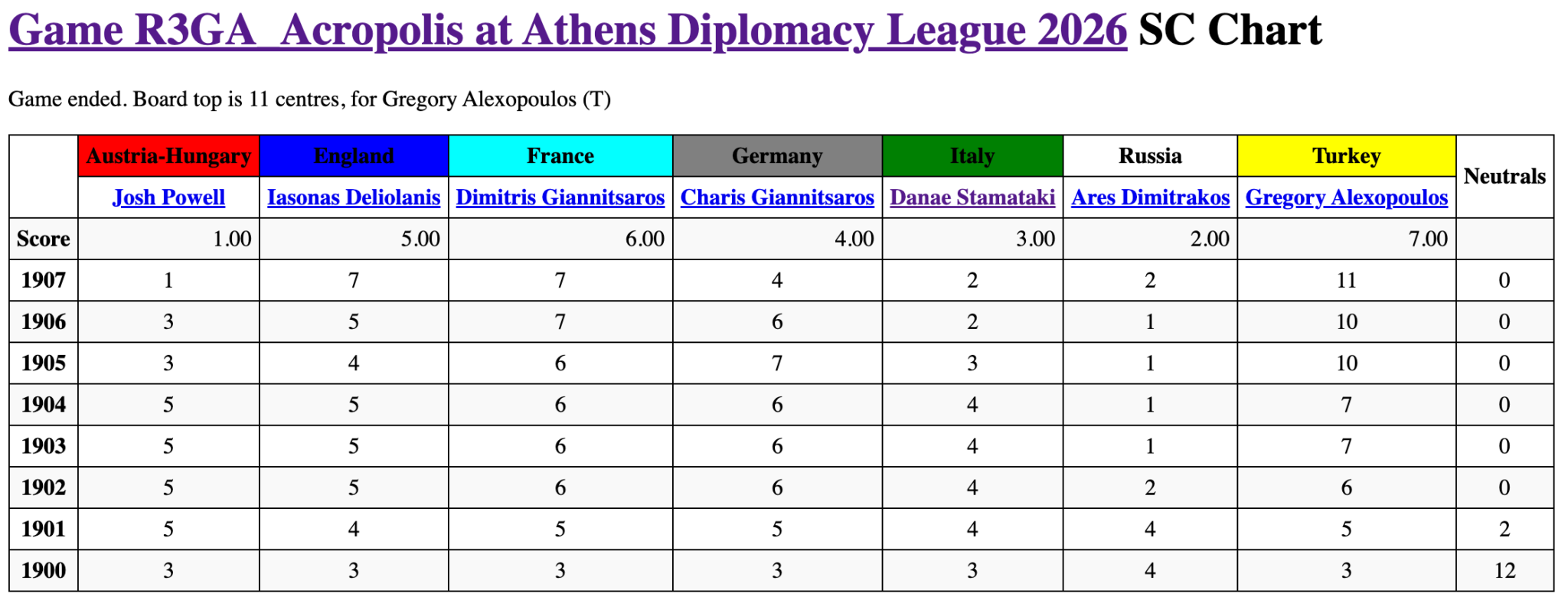 και έτσι φτάνουμε στο end game, με τις Τουρκία, Γερμανία, Ρωσία να κάνουν race στην τελική ευθεία, την Αγγλία και την Ιταλία να γίνονται eliminated στον τελευταίο γύρο και από την ισοβαθμία με 11 κέντρα στην κορυφή, νικητής να αναδεικνύεται ο Αλέξης και η Γερμανία μιας και πρώτη έφτασε στη μεγέθυνση με δεύτερο το Γιώργο και τη Ρωσία: